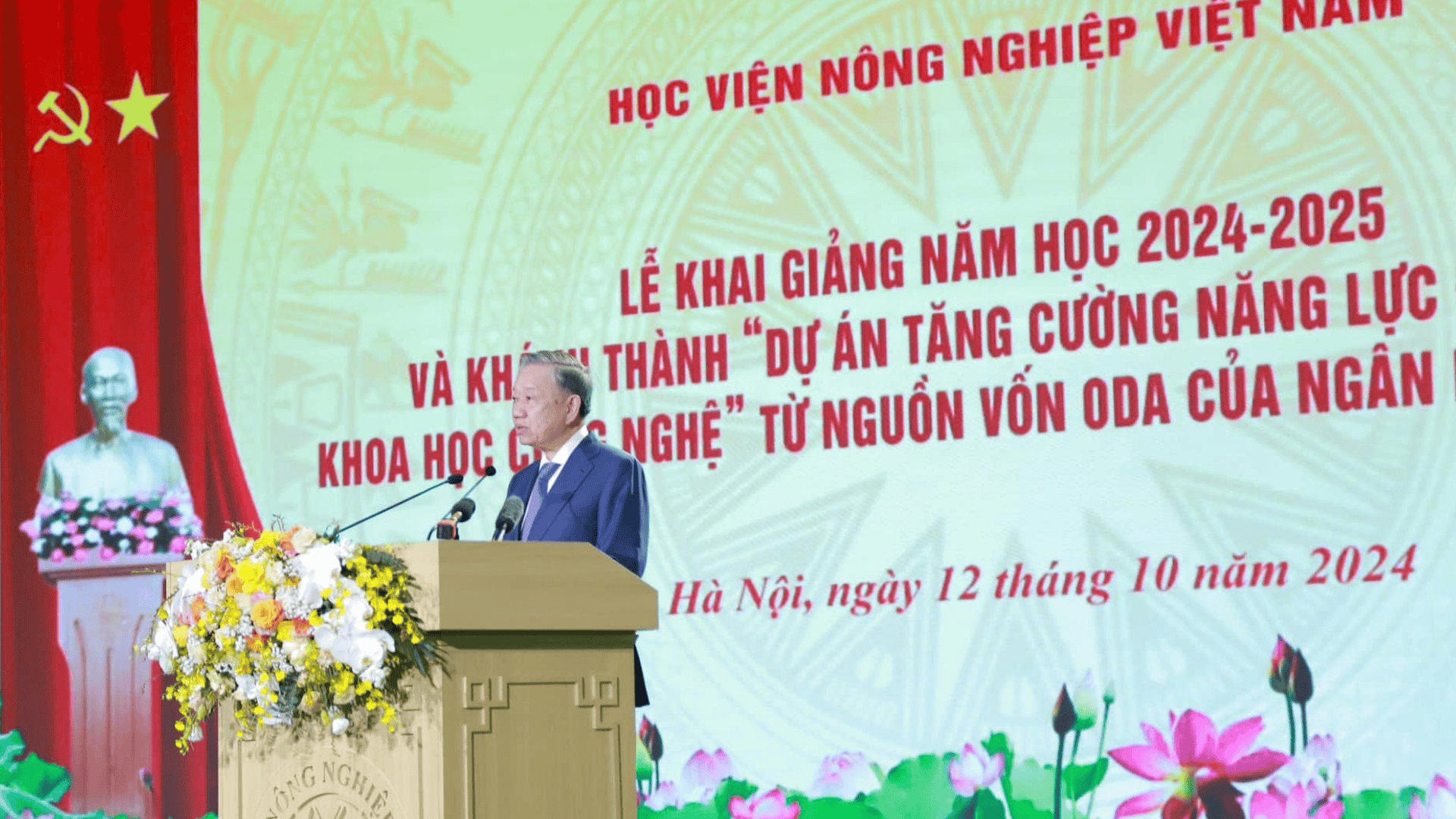 Thay mặt lãnh đạo Đảng, Nhà nước, Tổng Bí thư, Chủ tích nước Tô Lâm ghi nhận và biểu dương những thành tựu to lớn mà Học viện Nông nghiệp Việt Nam đã đạt được trong đào tạo, nghiên cứu khoa học và phục vụ xã hội trong thời gian qua.