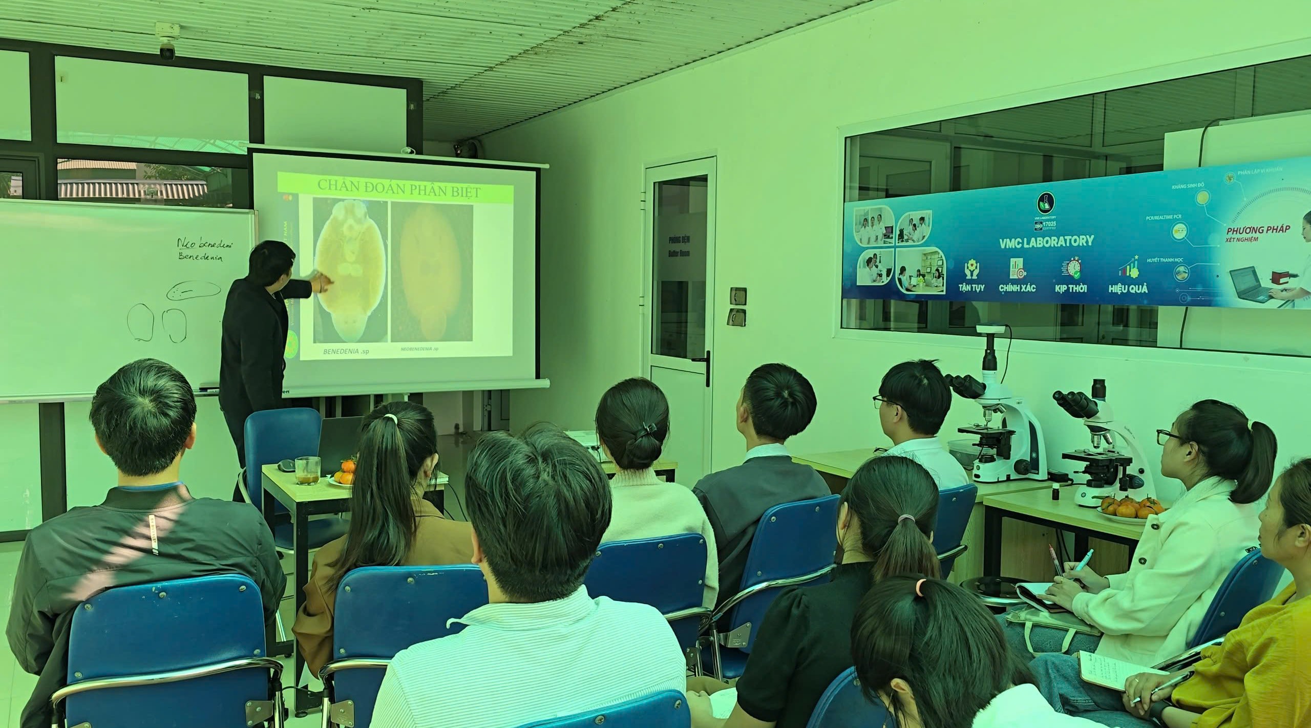 Trong 3 ngày 28/11 đến 30/11/2024, tại công ty VMC Việt Nam, chương trình tập huấn và chia sẻ kiến thức về thuốc kháng sinh, vấn đề kháng kháng sinh và kỹ thuật xét nghiệm và chẩn đoán bệnh cho cá biển đã được tổ chức trong không khí tin cậy và cởi mở. Đây là minh chứng cho một mô hình hợp tác mới, hài hòa giữa trí tuệ của Nhà khoa học, năng lực sản xuất tiên tiến và sức mạnh phân phối, nhằm mang lại hiệu quả thực tế cho lĩnh vực nuôi cá biển tại khu vực các tỉnh miền Bắc và Bắc trung bộ.