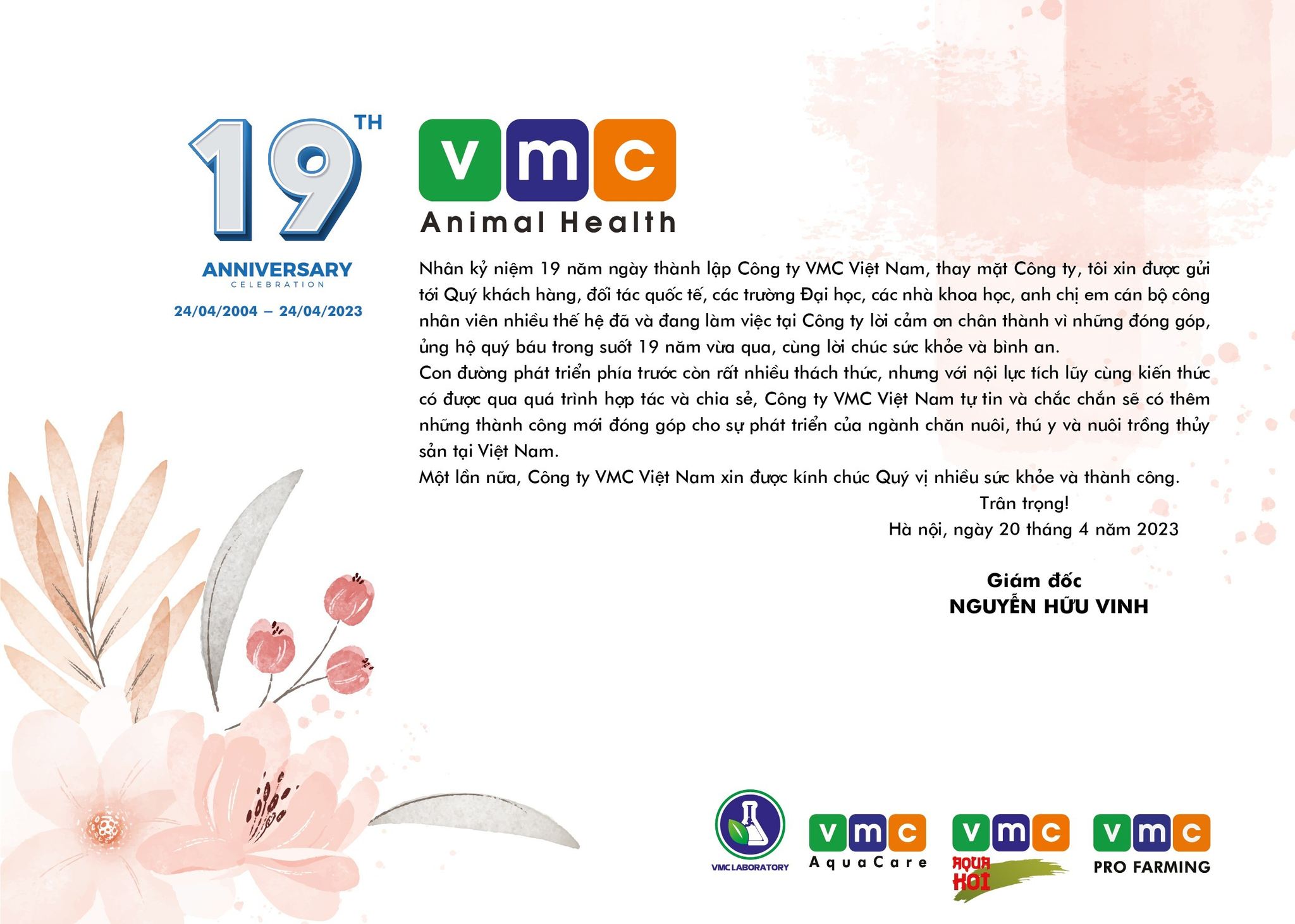 Nhân kỷ niệm 19 năm ngày thành lập Công ty VMC Việt Nam, thay mặt công ty, tôi xin được gửi tới Quý khách hàng, đối tác quốc tế, các trường Đại học, các nhà khoa học, anh chị em cán bộ, công nhân viên nhiều thế hệ đã và đang làm việc tại công ty lời cảm ơn chân thành vì những đóng góp, ủng hộ quý báu trong suốt 19 năm vừa qua, cùng lời chúc sức khỏe và bình an