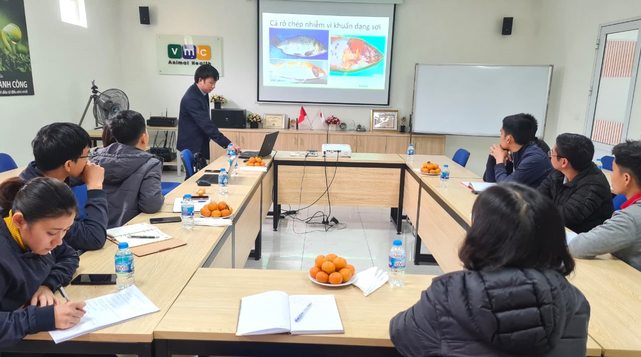 Hiện nay, nghề nuôi cá nước ngọt đang phát triển mạnh. Vào vụ Đông Xuân, thời tiết thay đổi thất thường, có rất nhiều bệnh xảy ra làm thiệt hại không nhỏ đến năng suất của người nuôi. Nhằm củng cố kỹ thuật, nâng cao năng lực chuẩn đoán bệnh trên cá nước ngọt trong vụ Đông Xuân của cán bộ kỹ thuật và các đại lý phân phối thuốc thú y – thủy sản, công ty VMC Việt Nam đã mời TS Trương Đình Hoài – Trưởng Bộ môn Môi trường và Bệnh học Thủy sản, Học viện Nông nghiệp Việt Nam về nhà máy của công ty trực tiếp giảng dạy.