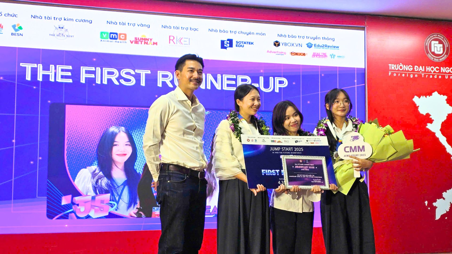Tại Trường Đại học Ngoại Thương, ngày 6/6/2025 – Với sứ mệnh phát triển nguồn nhân lực chất lượng cao và cam kết đồng hành cùng thế hệ trẻ, Công ty VMC Việt Nam vinh dự tham gia tài trợ và đồng hành cùng Đêm chung kết cuộc thi năng lực tiếng Anh Jumpstart 2025, do Khoa Tiếng Anh Thương mại – Trường Đại học Ngoại thương tổ chức.