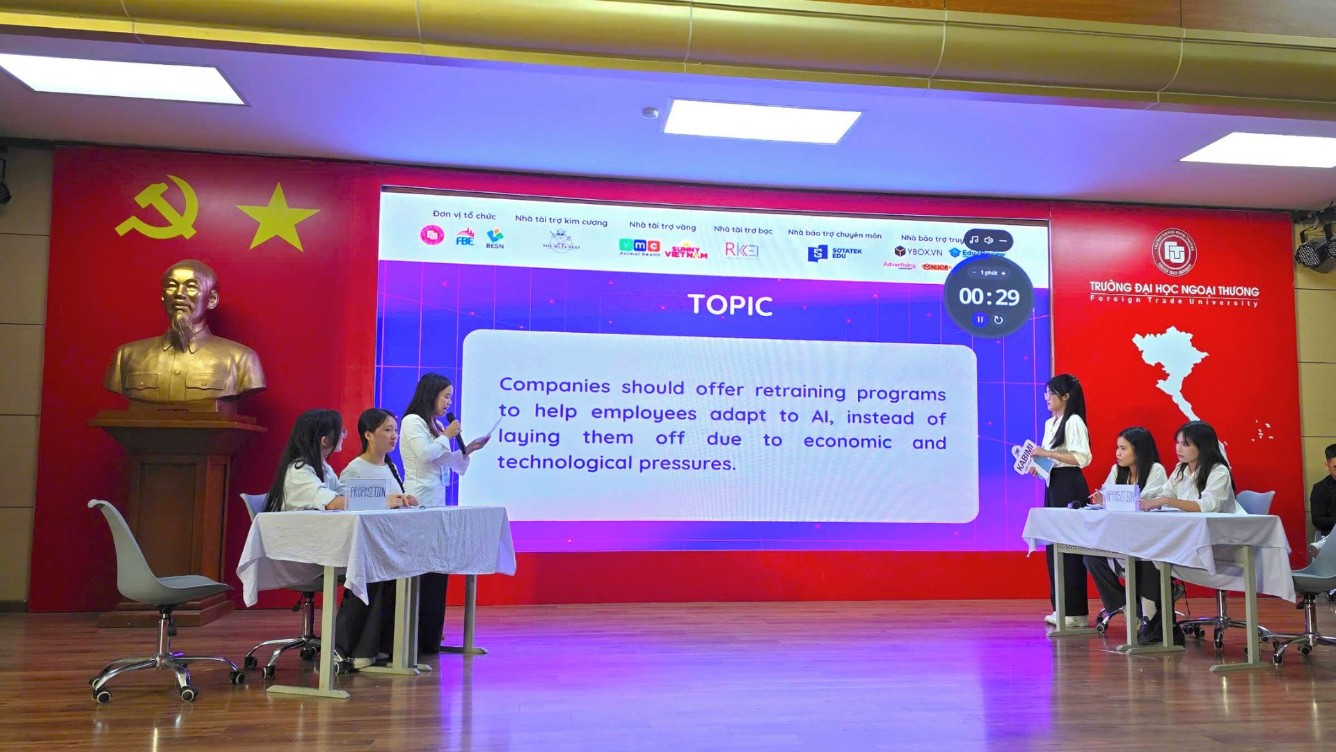 Trải qua các vòng thi gay cấn và vòng truyền thông sôi động, 4 đội thi xuất sắc nhất đã cùng tranh tài tại Đêm chung kết diễn ra vào ngày 6/6/2025 tại Đại học Ngoại thương. Với chủ đề "AI và tương lai của lực lượng lao động" – một chủ đề mang tính thời sự toàn cầu – cuộc thi không chỉ tạo ra môi trường thi đấu tiếng Anh đầy thử thách mà còn khơi gợi tư duy phản biện, sáng tạo và khả năng thích ứng của sinh viên trước sự phát triển mạnh mẽ của công nghệ, đặc biệt là trí tuệ nhân tạo trong bối cảnh toàn cầu hóa.
